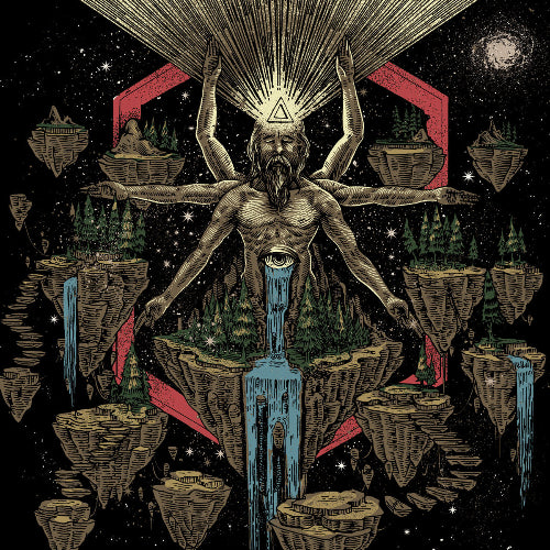 Artistic depiction of a multi-armed figure with a central eye, surrounded by floating islands and celestial elements.