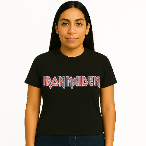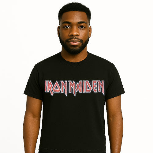 Person wearing a black t-shirt with Iron Maiden logo on a white background