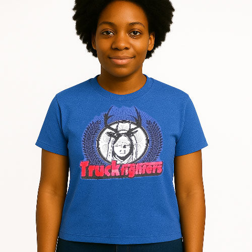 Blue t-shirt with graphic design and 'Truckfighters' text on a white background