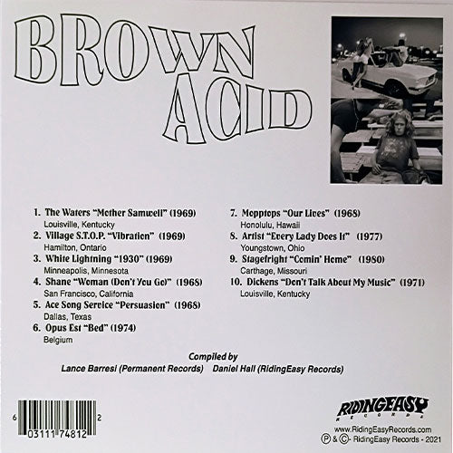 Back cover of a music album titled 'Brown Acid' with tracklist and album details.