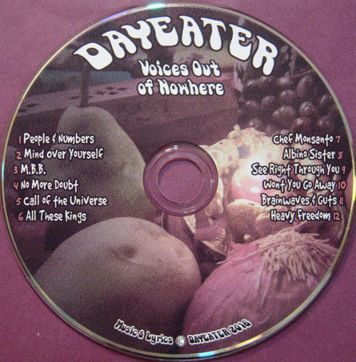 CD label for 'Dayeater: Voices Out of Nowhere' with fruit imagery and tracklist.