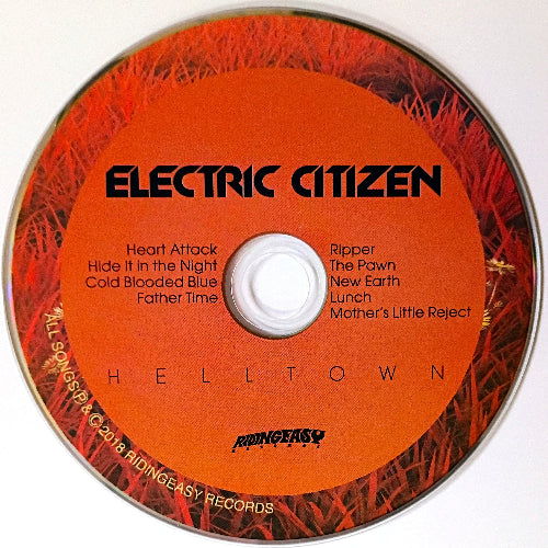 Album cover for 'Helltown' by Electric Citizen with futuristic人类 and landscape.