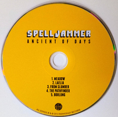 CD with 'Spelljammer: Ancient of Days' album cover featuring tracklist on a yellow background.