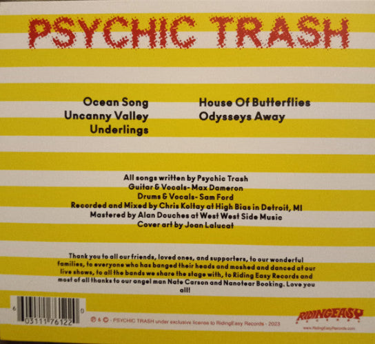 Les temps changent et les artistes gagnent en maturité : désormais sous le nom de PSYCHIC TRASH, Ford et Dameron débarquent chez Riding Easy Records en vétérans tournant une page, revigorés à l'idée de tracer une nouvelle voie et forts d'une décennie et demie de travail dans l'underground. Le premier album éponyme de Psychic Trash est résolument sans compromis, un brin théâtral, parfois survolté et d'une ampleur trompeuse par rapport à la profondeur du punk qui se cache derrière.