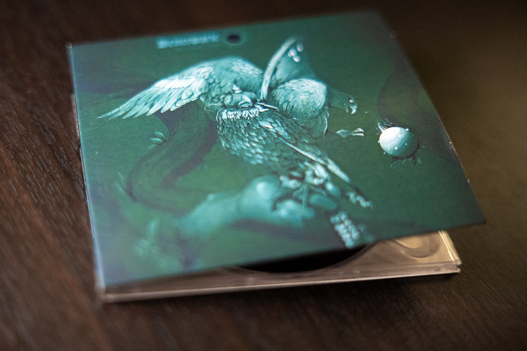 CD in a clear case with artistic design on a dark background